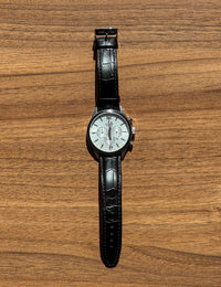 A sleek and elegant chronograph designed for everyday style. With its black leather strap and polished stainless steel case, this watch combines classic looks with modern functionality. Chronograph features and a date display make it both practical and stylish for any occasion.